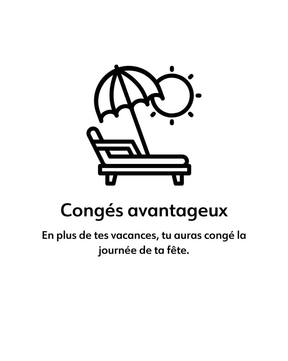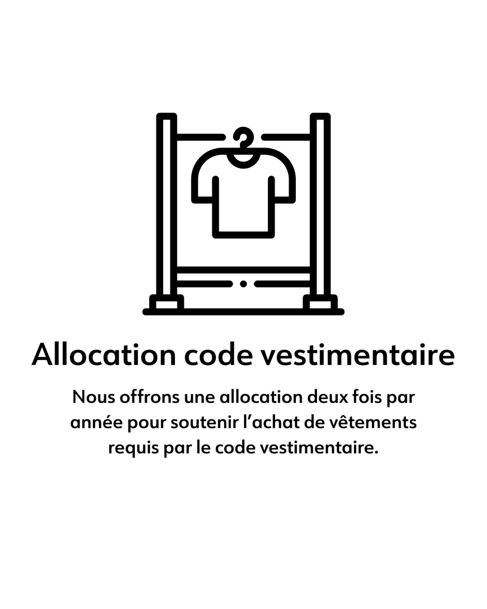 Nos employés bénéficient d’avantages conçus pour soutenir leur bien-être, notamment des rabais exclusifs, un programme d’aide aux employés, des horaires flexibles ainsi que des possibilités de développement professionnel. Le tout s’inscrit dans une ambiance de travail respectueuse et collaborative.